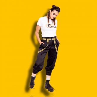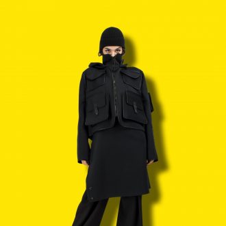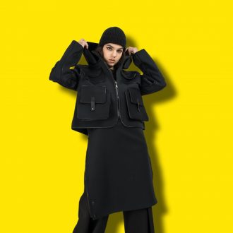 The trouser was made out of high quality runner fabric with thermic role. The product is meant to create a statement due to the multifunctionality pockets and the harness system which creates a cool look.